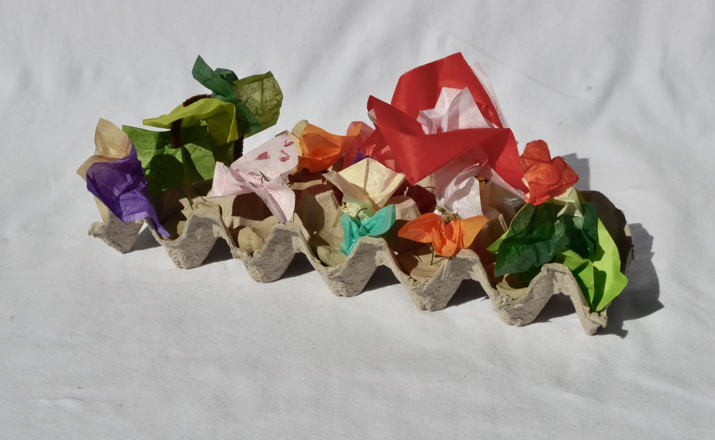 当花朵完成后,大家将它们放在盒子里,研究观察不同角度的效果,并在需要时添加其它花朵。种植完成后,大家可以选择在鸡蛋盒外面涂抹颜色。大家都创造了迷人的原始花园。