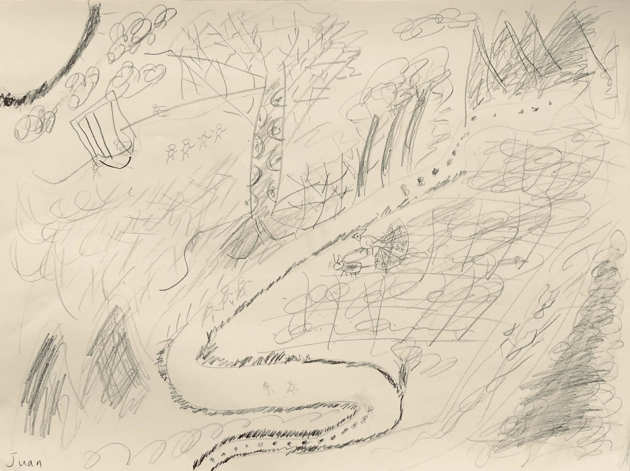 Luna妈妈的描述:今天问了她,内容好多挺热闹的。还知道画了影子,还有树和炊烟。云都被吹向右侧。爸爸站在帐篷前喊他们,妈妈在里面做饭。她和朋友在玩,弟弟做凳子上给她们拍照。还有湖,湖上面那棵树的落叶被扫到了一堆(就是下面黑色堆)