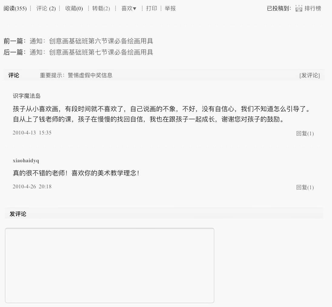 艺术教育,在学龄前到小学这个早期阶段是最重要的。如果孩子形成自主创作的绘画习惯,在看到有些绘画参考书、或者勾线的卡通书的时候,就不会去模仿。其他小朋友照着画,他就会想:看看他画的人,都是书上来的,我自已就能画的,为什么要照着画呢?这说明早期这一个阶段特别重要,自主创作奠定的基础会使孩子逐渐有一种抵抗力,比如之后的学校美术课,他们自己就能判断哪种方法和材料是好的。一旦早期阶段树立了这样的审美意识后,比如到了九、10岁绘画转型期,孩子会更关注心灵外部的事物,慢慢要走向写实性,会有一个对描摹事物外型特别热情的时间,因为她有对绘画表现的早期经验和自主认识,这样的孩子再描摹,也一定会有自已的想法,他们会用属于她自已的色彩感受等来完成,也就是他们的有个性的艺术表达方式,也是一个独特的思维方式。那么在做艺术创作活动的时候他们会以这种个性化方式来思考,做别的事情的时候也同样会用这种方式来思考。所以,如果能在早期阶段给孩子一些正确的观念培养,最终使孩子获益。